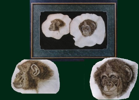 Cousins Working only in shades achieved by burning the Russian elkskin, the artist brings a depth of expression and attitude to his creations that is remarkable. Large and imposing at 27x41 inches, the museum quality of the deep shadow-boxed frame is in perfect counterpoint to the art it enhances, and the two portraits compliment each other in a rugged and primal way. In the profile work, the chimp seems to be watching the viewer from the corned of her eye...while in the face-on subject, the male's gaze follows the onlooker about the room. Entitled "Cousins", this piece is truly powerful. $2,600.00 |