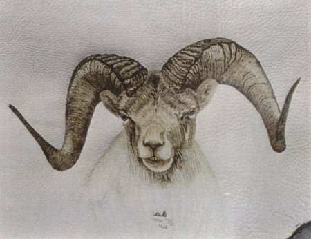 Smiley Burned into heavy mulehide, this work is a study in shading and contrast, expressing the power of a Bighorn sheep. Unframed at 19x27 inches, the ruggedness of the massive horns is in perfect counterpoint to the calm eyes and delicate front teeth. Framed to your taste it will highlight any wall, and is entitled "Smiley". $950.00 |