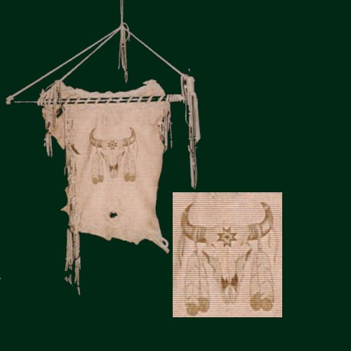 Medicine Skull Burned into Dakota elkskin, this tribute to a native American Spirit skull is designed to hang freely on a wall, or in a deep shadow-box. A combination of primitive power and contemporary style, it is suspended from a wrought-iron representation of an Indian "medicine pipe", and is trimmed in braidwork, dressed in cock feathers, glass pony and crow beads, buffalo-horn hairpipe, and several tobacco-filled pouches. Measuring 39x34 inches, and sure to promote observation and conversation, this work is called "Medicine Skull". $850.00 |