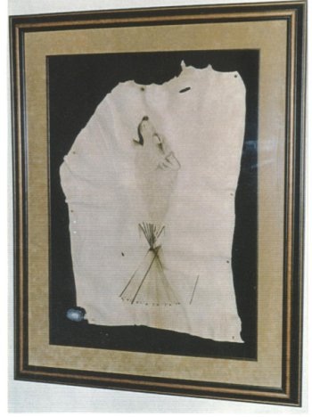 Spirit Brother This Large piece, burned into Russian elkskin and mounted with tiny Baltic-amber beads, features a representation of the spiritual relationship of the Plains Indians and the wolves that followed the buffalo herds. Appearing in the smoke above a Lakota Sioux tipi is the howling head of a wolf. The framing exposes all edges of the leather on black, highlighted by matching earth-tones in both the matting and the wood of the frame. Measuring 41x32 inches, this etheric work is entitled "Spirit Brother". $1,700.00 |